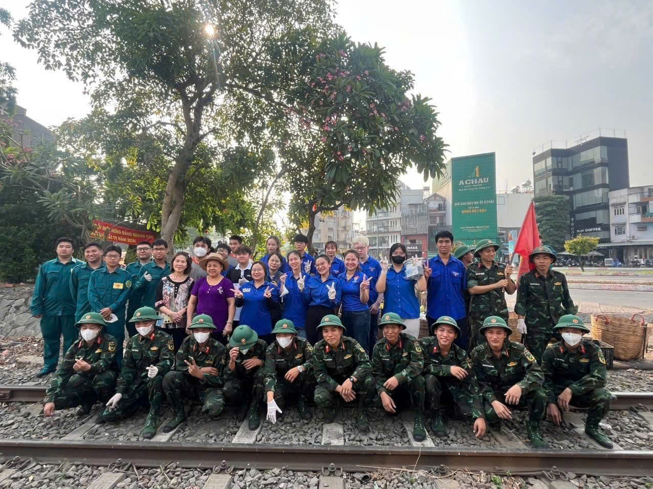 Đoàn viên thanh niên đang chung tay thu gom rác thải dọc tuyến đường sắt với tinh thần hăng hái, trách nhiệm