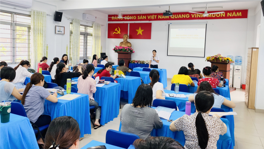Các thầy cô giáo tham gia tập huấn chương trình giáo dục phổ thông cho toàn bộ giáo viên trong trường.