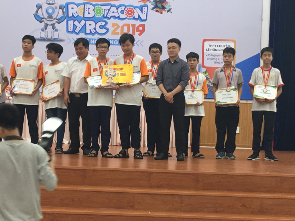 Cô Thùy Trang và các em học sinh tại cuộc thi Tài năng robot cấp quốc gia lần VII