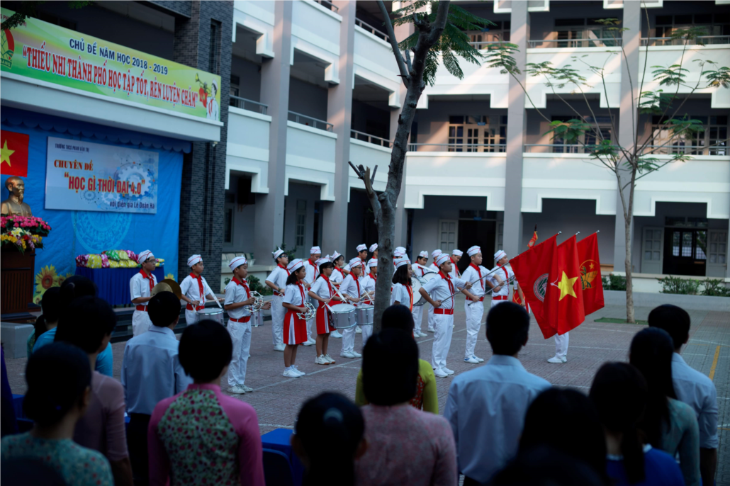 Thầy Phạm Phú Quốc Khánh Phó hiệu trưởng và cô Nguyễn Thị Minh Nhân Phó hiệu trưởng lên phát phần thưởng cho tập thể đạt giải trong hội thi nghi thức đội.