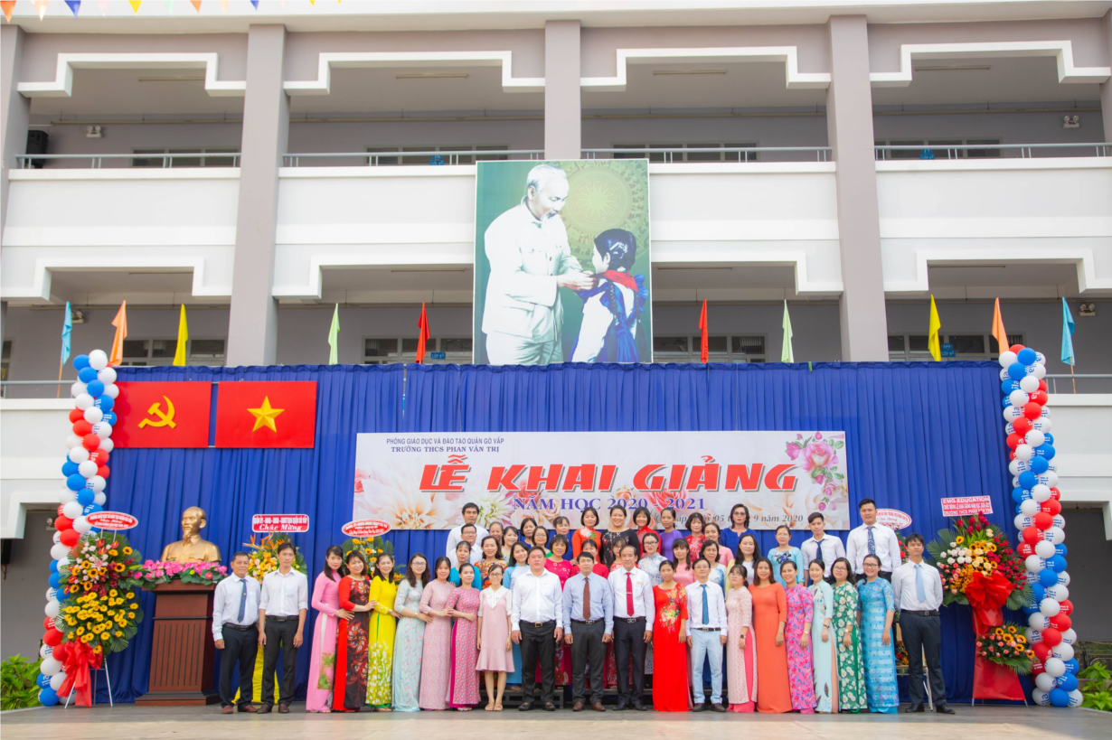 Ông Nguyễn Trí Dũng - Phó Bí thư thường trực Quận ủy - Chủ tịch Hội đồng nhân dân Quận, Ông Phạm Trung Kiên - Phó Bí thư Đảng ủy, Chủ tịch UBND Phường 7, chụp ảnh lưu niệm cùng tập thể Giáo viên công nhân viên nhà trường